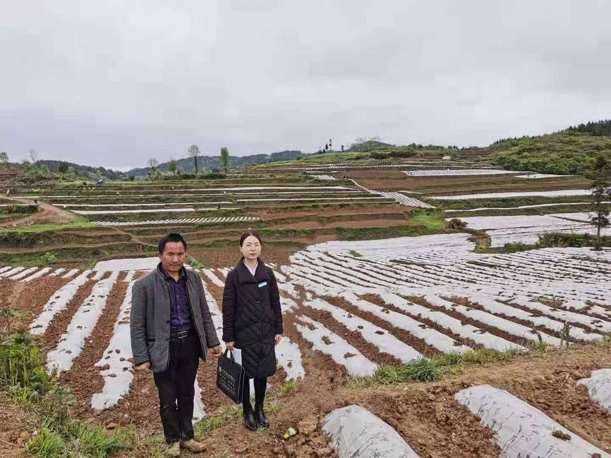 圖為簡加琴(右)在宅吉鄉(xiāng)為200畝烤煙種植大戶王勇現(xiàn)場調(diào)查授信