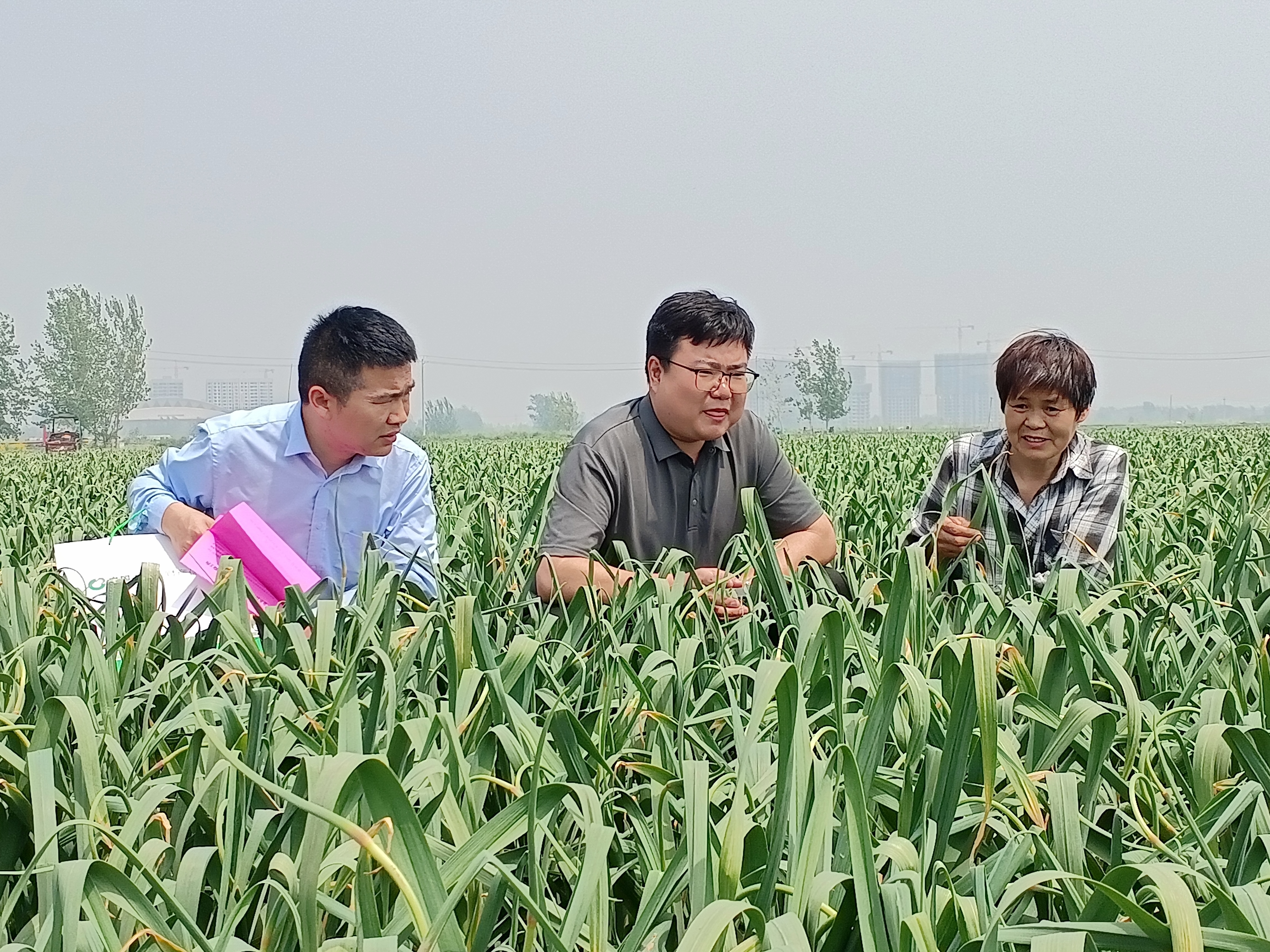 中國人壽財險山東省分公司工作人員與當地街道、村干部到田間向蒜農宣講大蒜目標收入保險 崔廣勛/攝